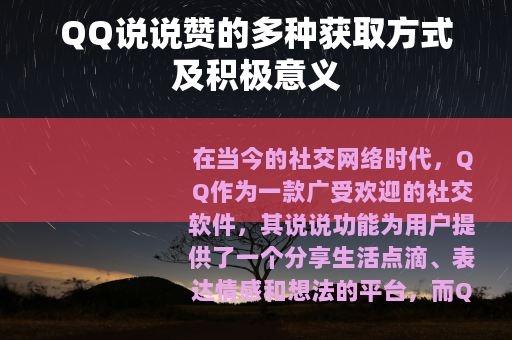 在当今的社交网络时代,QQ作为一款广受欢迎的社交软件,其说说功能为用户提供了一个分享生活点滴、表达情感和想法的平台,而QQ说说赞则成为了衡量一条说说受欢迎程度的重要指标之一,它有着多方面的意义和价值,也有着多种获取方式。