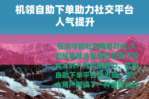 机领自助下单平台在社交网络领域中发挥着积极的作用,它为用户提供了一个展示自我、提升人气的良好平台,让社交变得更加丰富多彩,充满乐趣,随着技术的不断发展和用户需求的不断增加,相信机领自助下单平台也会不断完善和创新,为用户带来更多更好的服务和体验,助力用户在社交网络的世界中实现自己的价值和目标,收获更多的关注和认可,开启一段更加精彩的社交之旅。