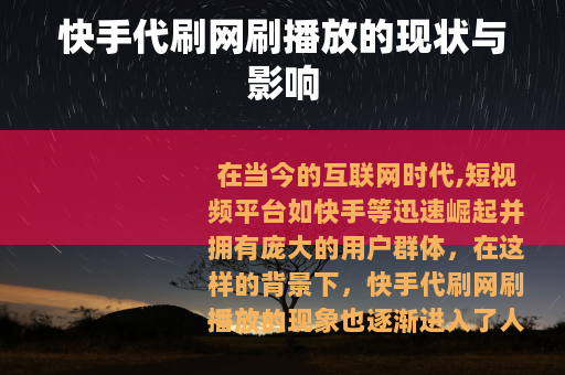 在当今的互联网时代,短视频平台如快手等迅速崛起并拥有庞大的用户群体,在这样的背景下,快手代刷网刷播放的现象也逐渐进入了人们的视野。