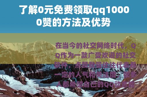 在当今的社交网络时代,QQ作为一款广受欢迎的社交软件,点赞数量往往代表着一定的人气和关注度,很多人都希望自己的QQ动态能够获得大量的赞,而0元免费领取qq10000赞的方式便应运而生,为众多QQ用户带来了新的机遇和乐趣。