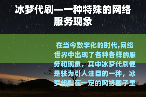 在当今数字化的时代,网络世界中出现了各种各样的服务和现象,其中冰梦代刷便是较为引人注目的一种,冰梦代刷在一定的网络圈子里逐渐有了自己的知名度,它为用户提供了一种别样的网络体验。