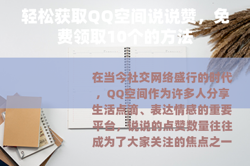 在当今社交网络盛行的时代,QQ空间作为许多人分享生活点滴、表达情感的重要平台,说说的点赞数量往往成为了大家关注的焦点之一,谁不想自己精心发布的说说能获得更多人的认可和喜爱呢?就来给大家介绍一种免费领取10个QQ空间说说赞的方法。