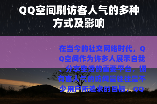 在当今的社交网络时代,QQ空间作为许多人展示自我、分享生活的重要平台,拥有高人气的访问量往往是不少用户所追求的目标,QQ空间刷访客人气的现象也随之出现,并且有着多种不同的方式。