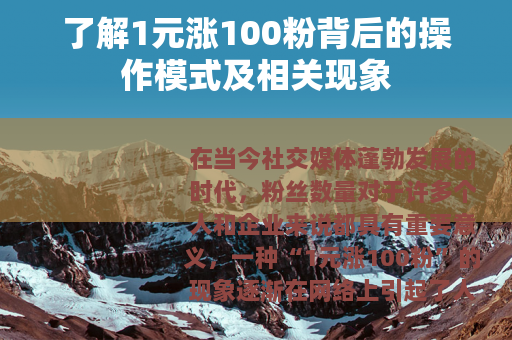 在当今社交媒体蓬勃发展的时代,粉丝数量对于许多个人和企业来说都具有重要意义,一种“1元涨100粉”的现象逐渐在网络上引起了人们的关注。