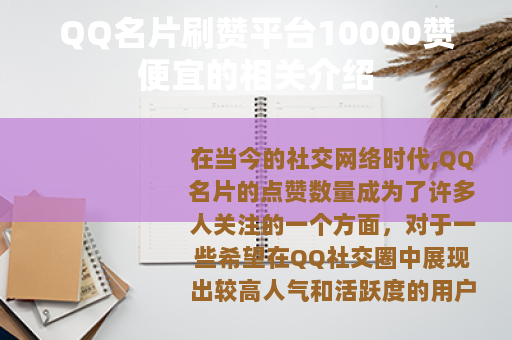 在当今的社交网络时代,QQ名片的点赞数量成为了许多人关注的一个方面,对于一些希望在QQ社交圈中展现出较高人气和活跃度的用户来说,拥有大量的名片赞是他们所追求的目标之一,而市场上也随之出现了众多宣称可以提供QQ名片刷赞服务且价格便宜的平台,其中能刷到10000赞的平台更是吸引了不少人的目光。