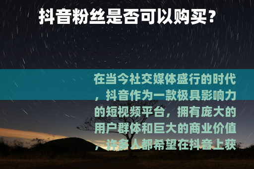 在当今社交媒体盛行的时代,抖音作为一款极具影响力的短视频平台,拥有庞大的用户群体和巨大的商业价值,许多人都希望在抖音上获得更多的关注和粉丝,以提升自己的影响力或实现商业目的,一个问题便应运而生:抖音粉丝可以买么?