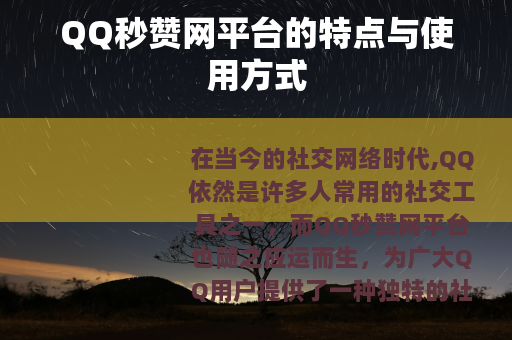 在当今的社交网络时代,QQ依然是许多人常用的社交工具之一,而QQ秒赞网平台也随之应运而生,为广大QQ用户提供了一种独特的社交互动体验。