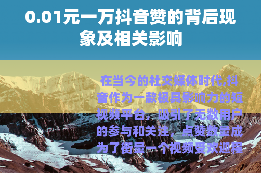 在当今的社交媒体时代,抖音作为一款极具影响力的短视频平台,吸引了无数用户的参与和关注,点赞数量成为了衡量一个视频受欢迎程度的重要指标之一,而近期,市场上出现了一种声称0.01元一万抖音赞的现象,引发了众多抖音用户的兴趣和讨论。