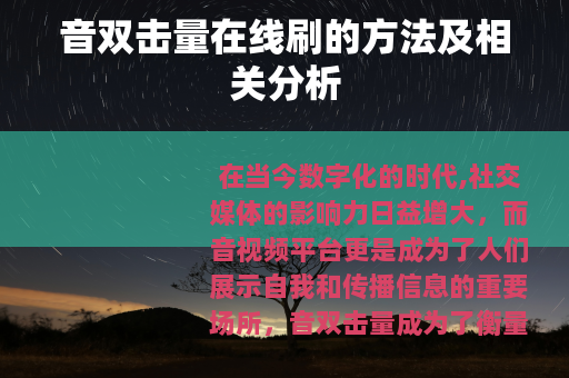 在当今数字化的时代,社交媒体的影响力日益增大,而音视频平台更是成为了人们展示自我和传播信息的重要场所,音双击量成为了衡量一个作品受欢迎程度的重要指标之一,许多创作者和用户都希望能够提高自己作品的双击量,从而获得更多的关注和认可,在这样的背景下,音双击量在线刷的现象逐渐兴起。