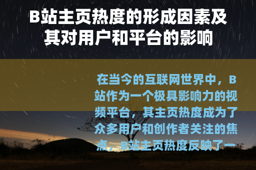 B站主页热度是一个复杂而又重要的现象,它是内容质量、用户互动和推荐算法等多种因素共同作用的结果,它为用户提供了丰富多样的内容选择和社交互动的机会,为平台的发展注入了强大的动力,在未来的发展中,我们期待B站能够继续保持其独特的优势,不断提升主页热度的质量和价值,为用户和创作者创造更加美好的互联网视频生态环境。