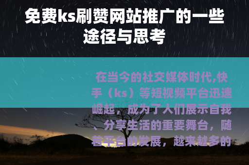 在当今的社交媒体时代,快手(ks)等短视频平台迅速崛起,成为了人们展示自我、分享生活的重要舞台,随着平台的发展,越来越多的用户渴望自己的作品能够获得更多的点赞,从而提升自己的知名度和影响力,在这种需求下,免费ks刷赞网站的推广逐渐进入了人们的视野。