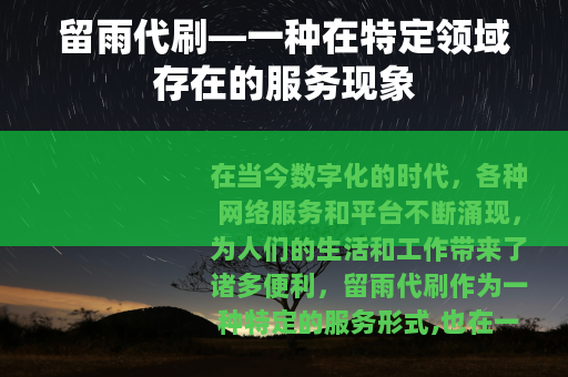 在当今数字化的时代,各种网络服务和平台不断涌现,为人们的生活和工作带来了诸多便利,留雨代刷作为一种特定的服务形式,也在一定的网络环境中存在着。