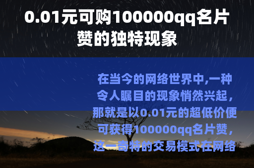 在这个充满机遇和挑战的网络时代,0.01元100000qq名片赞的现象只是众多网络现象中的一个缩影,它提醒我们,在面对各种新奇的网络服务和交易时,要保持清醒的头脑,充分认识其利弊,做出明智的选择,也促使我们不断思考和探索如何在网络社交中实现真实与虚拟的平衡,让科技更好地服务于我们的社交生活,让我们的社交生活更加丰富多彩、有意义,无论是个人用户还是社交平台,都需要在这个过程中不断努力,共同推动网络社交向更加健康、有序的方向发展,让名片赞等社交元素真正成为我们社交生活中的美好点缀,而不是破坏社交生态的负面因素,我们要以积极的态度去面对和引导这种现象,使其在合法合规、符合道德伦理的前提下,为我们的社交生活带来更多的价值和乐趣,让网络社交成为我们展示自我、结交朋友、分享生活的理想平台,在这个虚拟的世界中创造出真实而美好的社交体验。