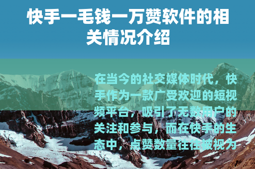 在当今的社交媒体时代,快手作为一款广受欢迎的短视频平台,吸引了无数用户的关注和参与,而在快手的生态中,点赞数量往往被视为衡量一个作品受欢迎程度的重要指标之一,市场上出现了一些声称可以提供快手一毛钱一万赞服务的软件,这一现象引起了不少人的兴趣。