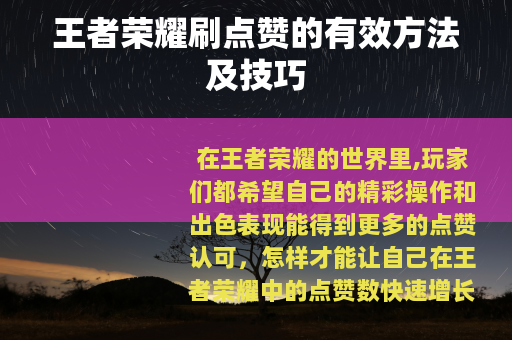 通过自身的努力和一些有效的方法,我们可以在王者荣耀中实现点赞数的快速增长,让自己的游戏之旅更加精彩。