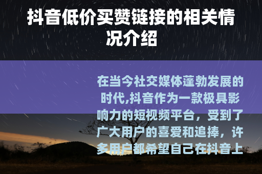 在当今社交媒体蓬勃发展的时代,抖音作为一款极具影响力的短视频平台,受到了广大用户的喜爱和追捧,许多用户都希望自己在抖音上发布的作品能够获得更多的点赞,从而提高作品的热度和曝光度,在这样的需求下,抖音低价买赞链接便应运而生。