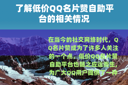 在当今的社交网络时代,QQ名片赞成为了许多人关注的一个点,低价QQ名片赞自助平台也随之应运而生,为广大QQ用户提供了一种获取名片赞的便捷途径。