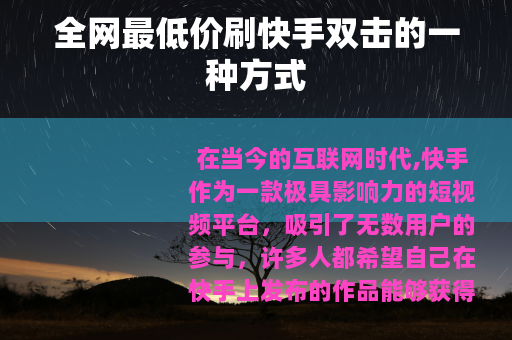 在当今的互联网时代,快手作为一款极具影响力的短视频平台,吸引了无数用户的参与,许多人都希望自己在快手上发布的作品能够获得更多的双击,也就是点赞,因为这不仅代表着作品受到了他人的喜爱,还能在一定程度上提升账号的热度和影响力,市场上出现了各种各样声称可以提供刷快手双击服务的商家,其中全网最低价刷快手双击的宣传更是吸引了不少人的目光。