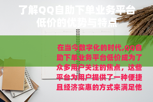 在当今数字化的时代,QQ自助下单业务平台低价成为了众多用户关注的焦点,这些平台为用户提供了一种便捷且经济实惠的方式来满足他们在QQ相关业务方面的需求。