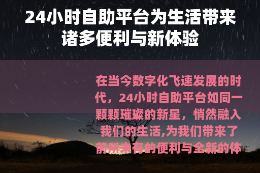 24小时自助平台作为数字化时代的产物,已经成为我们生活中不可或缺的一部分,它以其便捷、高效、个性化的特点,为我们的生活带来了诸多便利与新体验,让我们的生活变得更加丰富多彩,我们应该积极拥抱这一趋势,充分利用这些平台的优势,同时也要注意解决可能出现的问题,让24小时自助平台更好地服务于我们的生活和社会发展,随着科技的不断进步,相信24小时自助平台将会不断完善和创新,为我们带来更多的惊喜和价值。