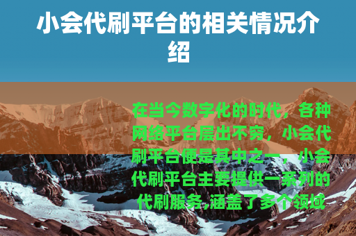 在当今数字化的时代,各种网络平台层出不穷,小会代刷平台便是其中之一,小会代刷平台主要提供一系列的代刷服务,涵盖了多个领域。