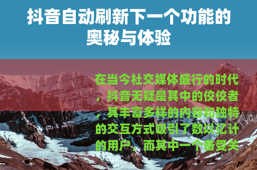 抖音的自动刷新下一个功能以其便捷性、智能性和趣味性,成为了众多用户喜爱的一个重要功能,它不仅为用户带来了更好的观看体验,也为抖音平台的发展注入了新的活力,相信在未来,随着技术的不断进步和用户需求的不断变化,这一功能还会不断地优化和完善,为我们带来更多的惊喜和欢乐。