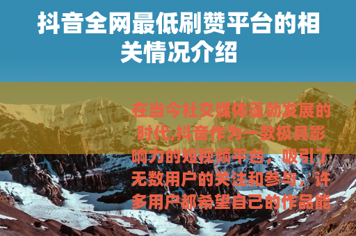在当今社交媒体蓬勃发展的时代,抖音作为一款极具影响力的短视频平台,吸引了无数用户的关注和参与,许多用户都希望自己的作品能够获得更多的点赞,从而提升在平台上的知名度和影响力,在这样的背景下,抖音全网最低刷赞平台应运而生。