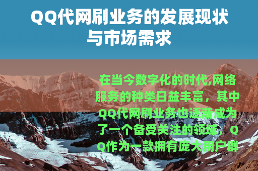 在当今数字化的时代,网络服务的种类日益丰富,其中QQ代网刷业务也逐渐成为了一个备受关注的领域,QQ作为一款拥有庞大用户群体的社交软件,其相关的业务拓展也呈现出多样化的趋势,QQ代网刷业务便是在这样的背景下应运而生的。