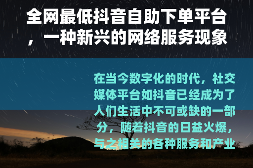 在当今数字化的时代,社交媒体平台如抖音已经成为了人们生活中不可或缺的一部分,随着抖音的日益火爆,与之相关的各种服务和产业也应运而生,其中就包括所谓的全网最低抖音自助下单平台。