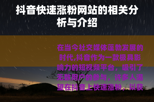 在当今社交媒体蓬勃发展的时代,抖音作为一款极具影响力的短视频平台,吸引了无数用户的参与,许多人渴望在抖音上快速涨粉,以获得更多的关注和机会,而抖音快速涨粉网站也随之应运而生。