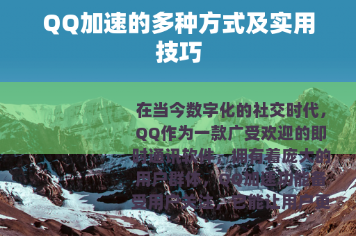 在当今数字化的社交时代,QQ作为一款广受欢迎的即时通讯软件,拥有着庞大的用户群体,QQ加速功能备受用户关注,它能让用户更快地提升QQ等级,享受更多的特权和服务,以下将为大家详细介绍QQ加速的相关内容。