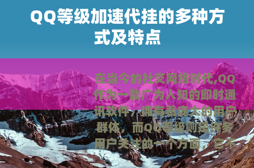 在当今的社交网络时代,QQ作为一款广为人知的即时通讯软件,拥有着庞大的用户群体,而QQ等级则是许多用户关注的一个方面,它不仅代表着用户在QQ世界中的资历,还能带来一些独特的特权和标识,QQ等级加速代挂服务应运而生,为用户提供了一种快速提升QQ等级的途径。