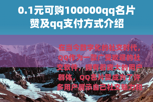 0.1元100000qq名片赞及QQ支付的结合,为QQ用户带来了一种全新的社交体验和价值提升方式,它在满足用户社交需求、推动社交生态发展等方面都发挥了积极的作用,只要用户能够理性对待,选择可靠的商家,就可以在享受这种服务的同时,更好地展示自己的社交魅力,拓展自己的社交圈子,在未来,随着技术的不断进步和市场的不断变化,相信这种服务还会不断完善和发展,为用户带来更多的惊喜和便利。
