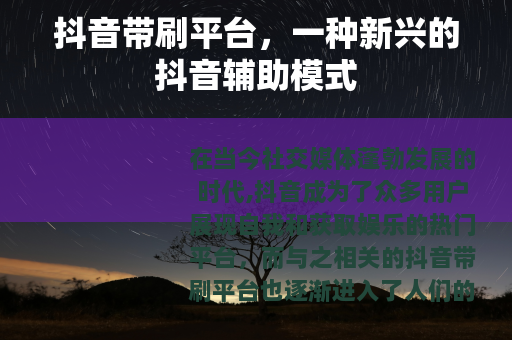在当今社交媒体蓬勃发展的时代,抖音成为了众多用户展现自我和获取娱乐的热门平台,而与之相关的抖音带刷平台也逐渐进入了人们的视野。