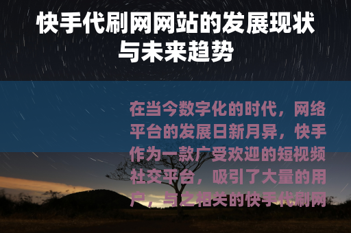 快手代刷网网站在未来的发展中具有很大的潜力和机遇,但也需要面对诸多的挑战和问题,我们要以积极的态度看待其发展,通过各方的共同努力,使其在规范、健康、有序的轨道上不断前进,为短视频行业的发展做出更大的贡献,希望在未来,快手代刷网网站能够不断创新和完善,为用户带来更多的价值和便利,成为短视频行业中不可或缺的一部分。