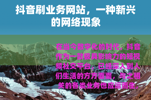 在当今数字化的时代,抖音作为一款极具影响力的短视频社交平台,已经深入到人们生活的方方面面,与之相关的各类业务也应运而生,其中抖音刷业务网站便是一种备受关注的现象。
