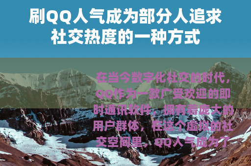 在当今数字化社交的时代,QQ作为一款广受欢迎的即时通讯软件,拥有着庞大的用户群体,在这个虚拟的社交空间里,QQ人气成为了许多人关注的焦点,刷QQ人气的现象也随之悄然兴起。