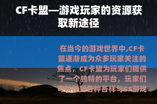 在当今的游戏世界中,CF卡盟逐渐成为众多玩家关注的焦点,CF卡盟为玩家们提供了一个独特的平台,玩家们可以找到各种各样与CF游戏相关的资源和服务。