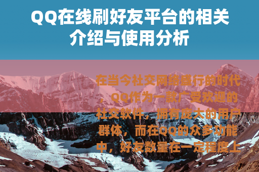在当今社交网络盛行的时代,QQ作为一款广受欢迎的社交软件,拥有庞大的用户群体,而在QQ的众多功能中,好友数量在一定程度上也代表着社交的广度,QQ在线刷好友平台应运而生。