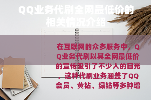 在互联网的众多服务中,QQ业务代刷以其全网最低价的宣传吸引了不少人的目光,这种代刷业务涵盖了QQ会员、黄钻、绿钻等多种增值服务,以看似诱人的价格为用户提供了快速提升QQ业务等级和享受更多特权的途径。