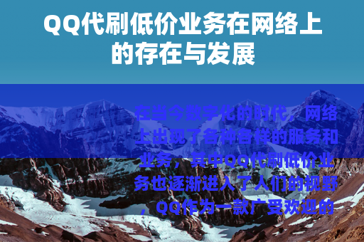 在当今数字化的时代,网络上出现了各种各样的服务和业务,其中QQ代刷低价业务也逐渐进入了人们的视野,QQ作为一款广受欢迎的社交软件,拥有庞大的用户群体,与之相关的代刷业务也应运而生。