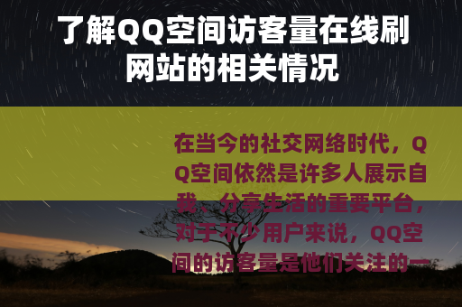 QQ空间访客量在线刷网站是一种通过特定技术手段,为用户的QQ空间快速增加访客量的平台,这些网站通常宣称能够在短时间内为用户带来大量真实有效的访客,从而提升用户QQ空间的热度和人气,它们的操作方式看似简单便捷,吸引了众多希望自己的QQ空间能更受关注的用户。