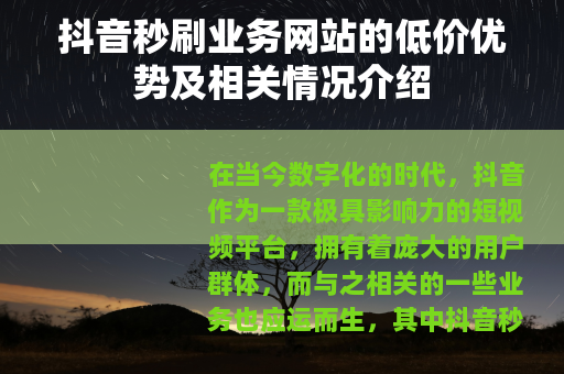 在当今数字化的时代,抖音作为一款极具影响力的短视频平台,拥有着庞大的用户群体,而与之相关的一些业务也应运而生,其中抖音秒刷业务网站受到了不少人的关注,尤其是那些声称价格最便宜的网站。