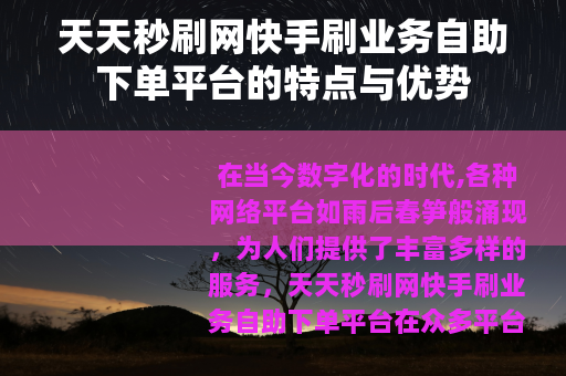 在当今数字化的时代,各种网络平台如雨后春笋般涌现,为人们提供了丰富多样的服务,天天秒刷网快手刷业务自助下单平台在众多平台中脱颖而出,受到了不少用户的关注。