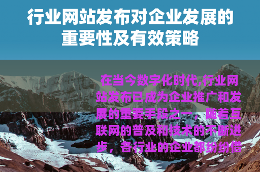 行业网站发布对于企业的发展具有重要意义,它为企业提供了一个展示自我、与行业内其他参与者交流合作的平台,通过合理的策略和有效的执行,企业能够在行业网站上获得更多的机会和资源,实现自身的发展和壮大,在未来,随着互联网技术的不断发展和行业竞争的加剧,行业网站发布的重要性将愈发凸显,企业应更加重视并充分利用这一有力工具,不断提升自己在行业内的竞争力和影响力,在数字化的浪潮中乘风破浪,驶向成功的彼岸。