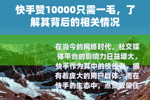 在当今的网络时代,社交媒体平台的影响力日益增大,快手作为其中的佼佼者,拥有着庞大的用户群体,而在快手的生态中,点赞数量往往被视为衡量一个作品受欢迎程度的重要指标之一,有一种说法在网络上流传开来,那就是快手赞10000只需一毛。