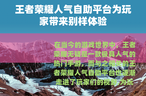 在当今的游戏世界中,王者荣耀无疑是一款极具人气的热门手游,而与之相关的王者荣耀人气自助平台也逐渐走进了玩家们的视野,为玩家们提供了一系列独特的服务和体验。
