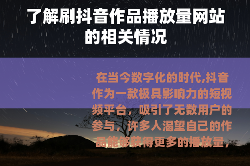 在当今数字化的时代,抖音作为一款极具影响力的短视频平台,吸引了无数用户的参与,许多人渴望自己的作品能够获得更多的播放量,从而在这个庞大的社交网络中获得更多的关注和认可,在这样的需求下,刷抖音作品播放量网站应运而生。
