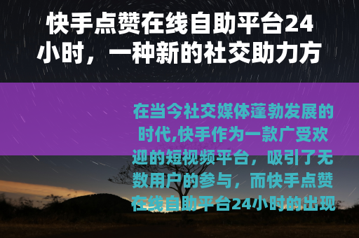 在当今社交媒体蓬勃发展的时代,快手作为一款广受欢迎的短视频平台,吸引了无数用户的参与,而快手点赞在线自助平台24小时的出现,为快手用户提供了一种全新的互动体验。