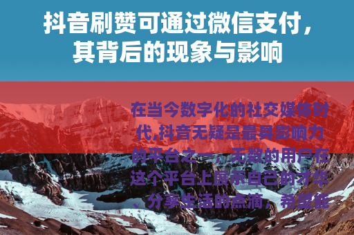 在当今数字化的社交媒体时代,抖音无疑是最具影响力的平台之一,无数的用户在这个平台上展示自己的才华、分享生活的点滴,希望能够获得更多的关注和点赞,而随着这种需求的增长,一种新的现象逐渐兴起,那就是刷赞,并且刷赞的支付方式之一是微信支付。